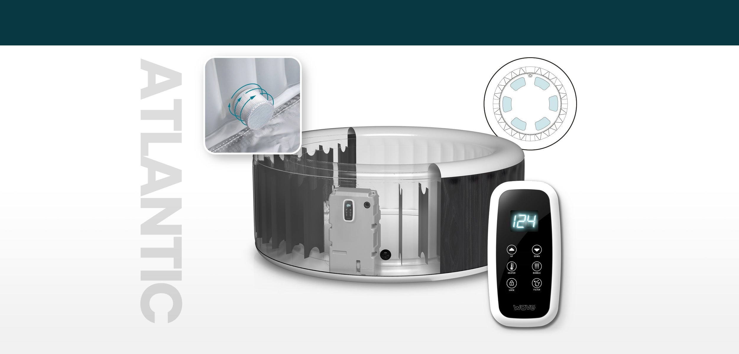 Introducing the Atlantic—our innovative 6-person inflatable hot tub. With a built-in heater integrated seamlessly into the walls, the Atlantic offers a sleek design and operates 15% quieter for a tranquil experience. Setting up the Atlantic is a breeze, taking just 15 minutes. With the included wired controller, you have complete control over your spa settings, ensuring a seamless and customisable spa experience.